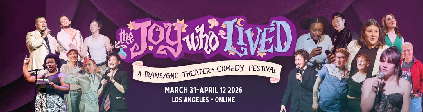 The Joy Who Lived is a month long, all-trans theater and comedy festival (running now thru April 12th). Due to proven interest from audiences and performers, this year has scaled dramatically from 2025’s inaugural festival (essentially, a handful of shows intended to counter-program the Harry Potter play running at the Pantages.) This year’s fest boasts a full month of all-trans and gender-nonconforming programming, including comedy, readings, solo shows, workshops, fundraisers and a Trans Community Day on April 11th. The event schedule presents abundant opportunities to engage. (FWIW I highly recommend checking out the work in progress from the musical duo Couplet, who are as entertaining as they are married3.)