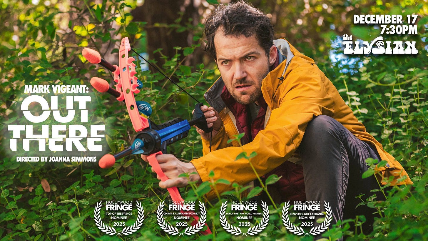 Hot off the announcement of his upcoming Dropout Presents special, The Best Man Show (streaming February 2026), Mark Vigeant is remounting his latest solo show Out There at the Elysian on December 17th. Earlier this year, Out There was nominated for Best of the Hollywood Fringe, and rightfully so. Building off the interactivity of The Best Man Show, Vigeant continues to hone his gift for inviting an audience to play along. And this time he levels up the production by adding some impressive onstage tech….
