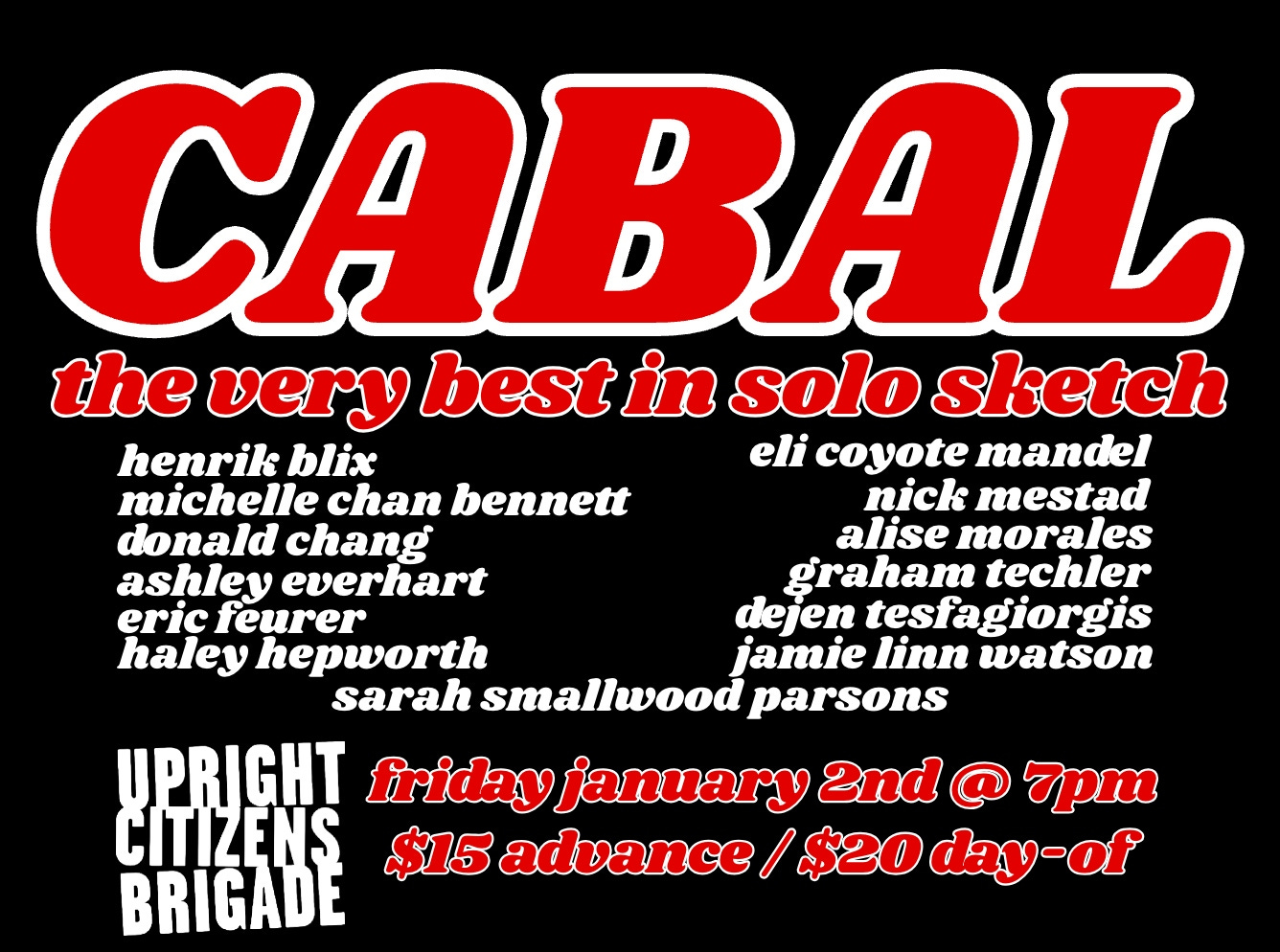 A killers row of my very favorite NY-based solo sketch performers (FKA “characters”) have joined together to create CABAL, a new show at UCB launching on January 2nd. It might be a new show, but the lineup is full of familiar faces. Many have been staples of Characters Welcome and Betty Night for years now.